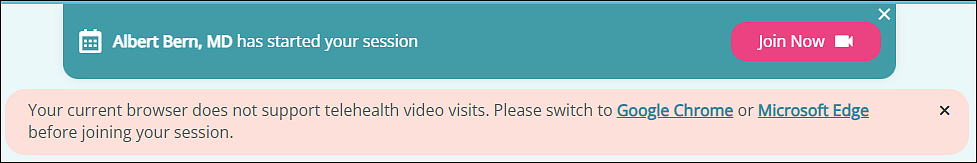Supported browsers are Google Chrome and Microsoft Edge. If you are accessing MYIO in a different browser, there will be an error banner, and the telehealth session will not be available.